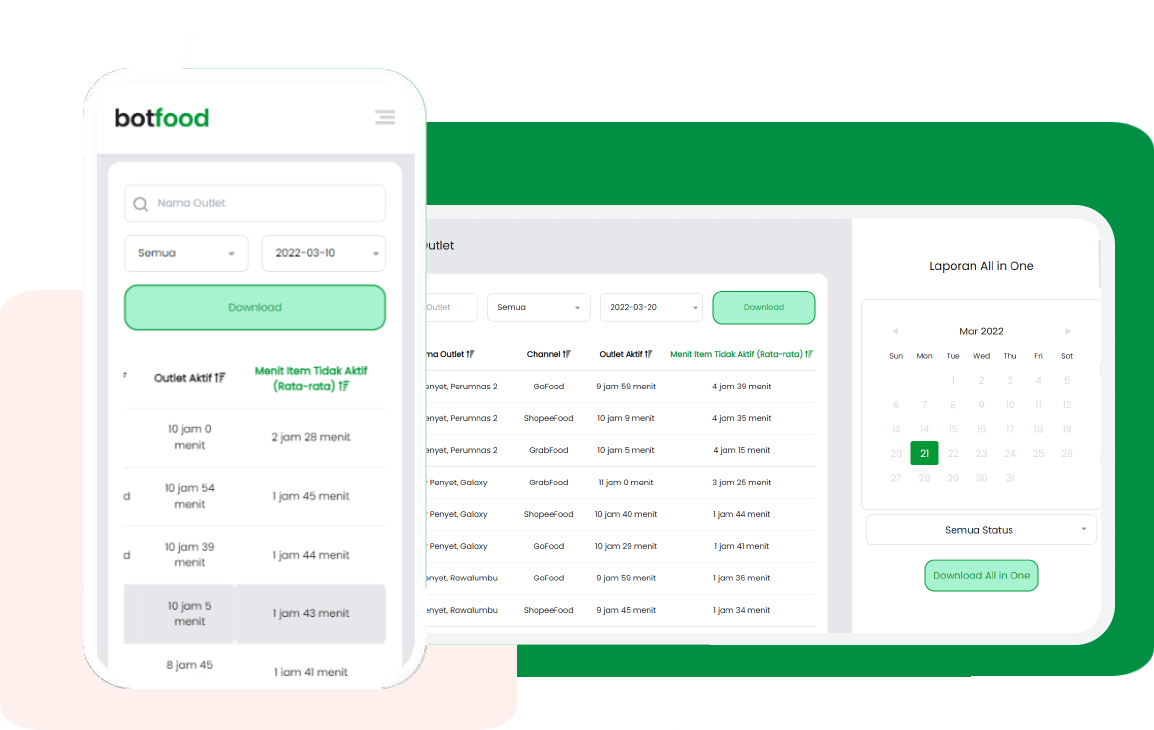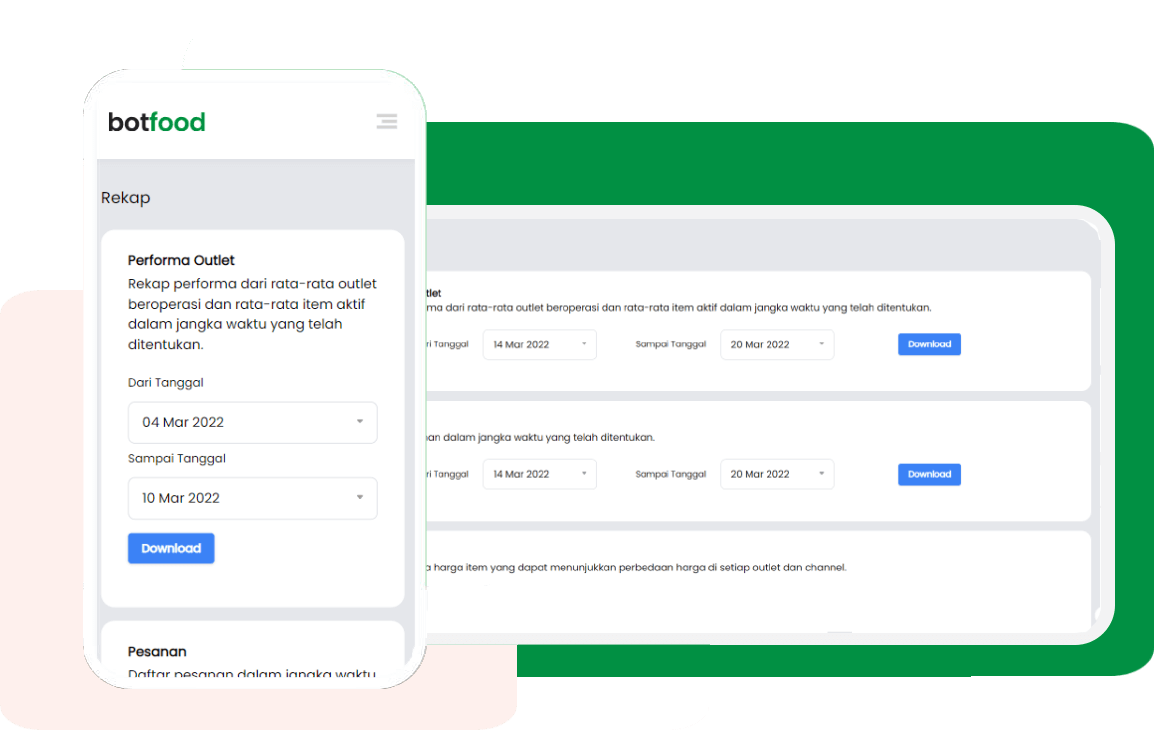 Botfood memiliki system real-time yang terdiri dari rekap harian (berupa Excel) yang sangat penting untuk memantau jalannya bisnis restaurant Anda. Mulai dari pemantauan jam buka-tutup restaurant online, menu yang aktif dan tidak aktif, dan lainnya sehingga dapat mengurangi terjadinya opportunity lost.